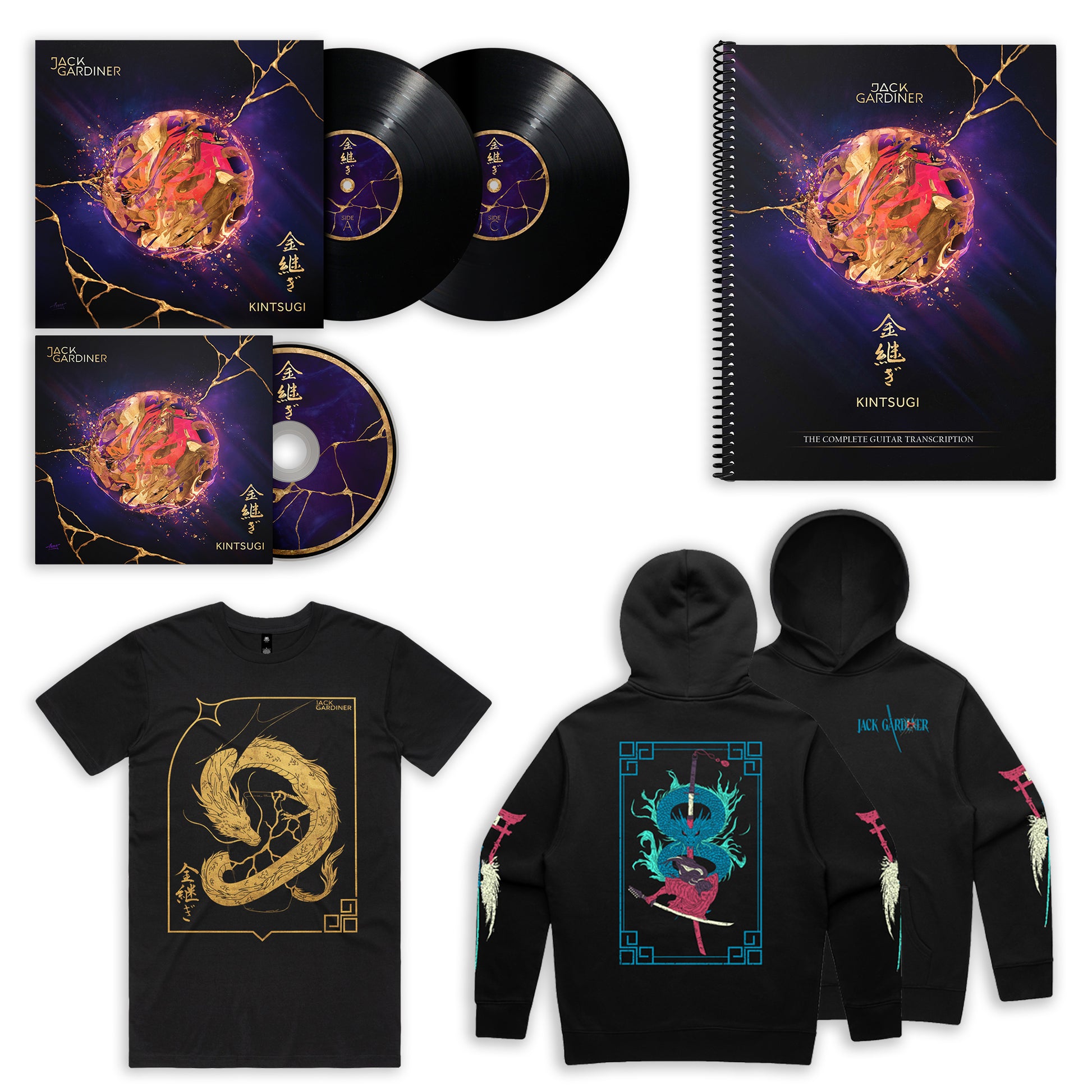 Includes the Kintsugi vinyl, CD, Fractured Steel hoodie, Golden Coil tee, and official tab book transcribed by Levi Clay. Plus, get the Kintsugi Digital Ultimate Package with over 6 hours of video lessons, transcriptions, high-quality backing tracks, video playthroughs, downloadable album, and Neural DSP presets.